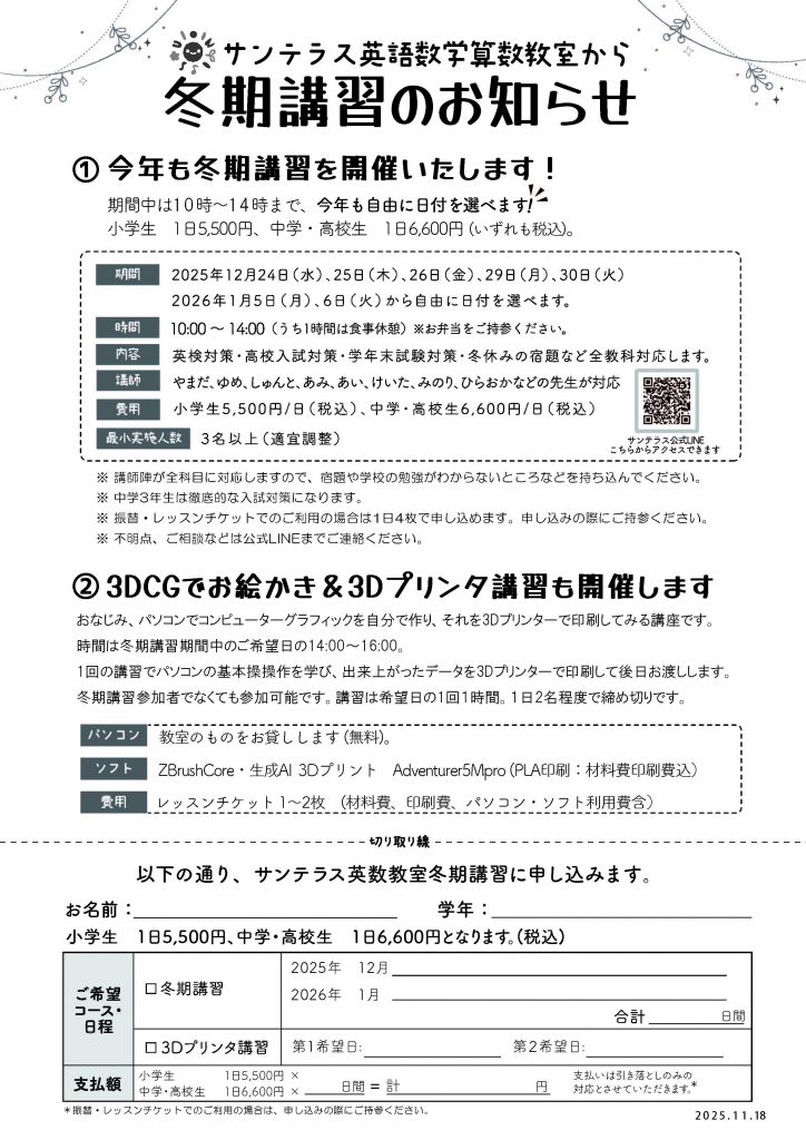 毎年恒例になりましたが、サンテラス英語数学算数教室入試・英検徹底対策講座として冬期講習を実施しています。